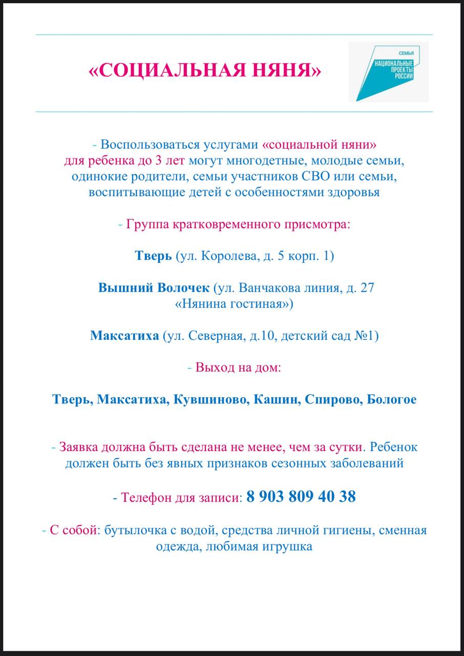 В рамках реализации национального проекта «Семья» с 1 января 2025 года в Тверской области начали действовать новые меры поддержки для семей, в том числе в июле 2025 года в Тверской области стартовала мера поддержки услуги «социальной няни» для детей до 3 лет из определенных категорий семей (Тверь, Максатиха, Кувшиново, Кашин, Спирово, Бологое).